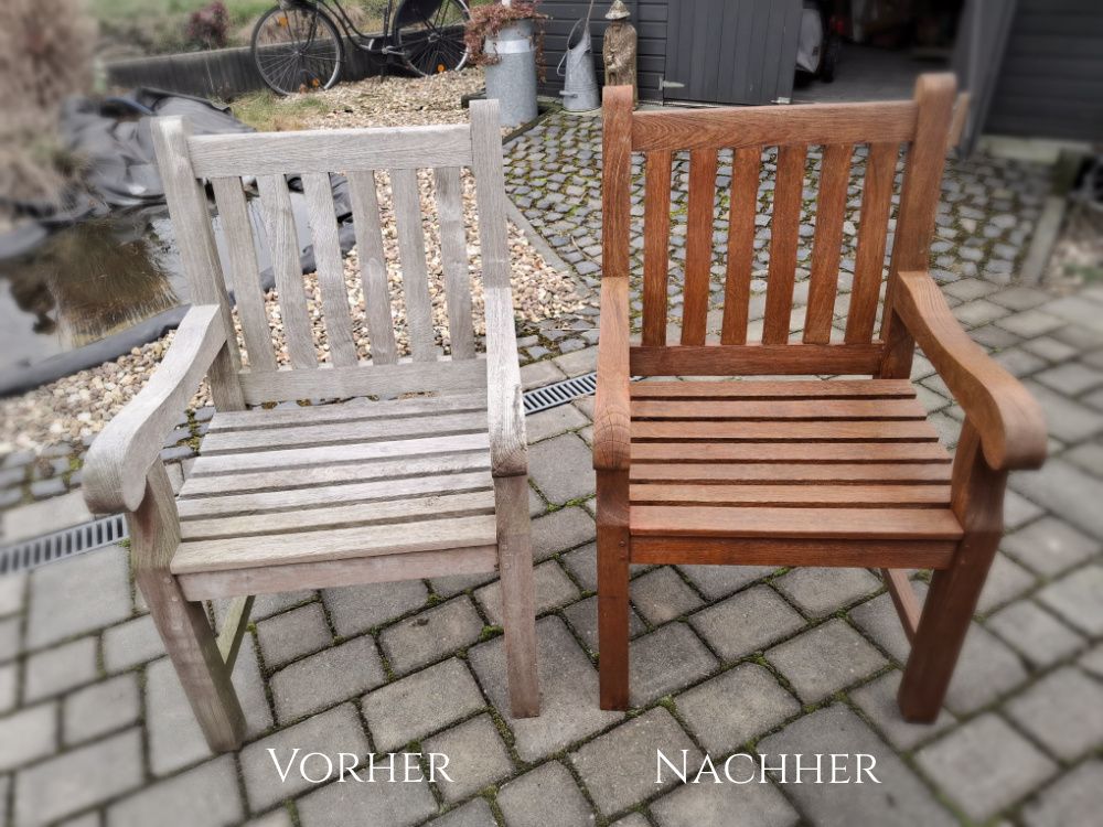 Dank meines kranken Januars bin ich über einen einzigen Teak-Stuhl der neuen (alten) Gartensitzgruppe noch nicht hinausgekommen, aber immerhin ;-))) Mir macht ja Anstreichen an der frischen Luft (mit Musik!) am allermeisten Spaß, aber es war auch die letzten Wochen einfach viel zu kalt.