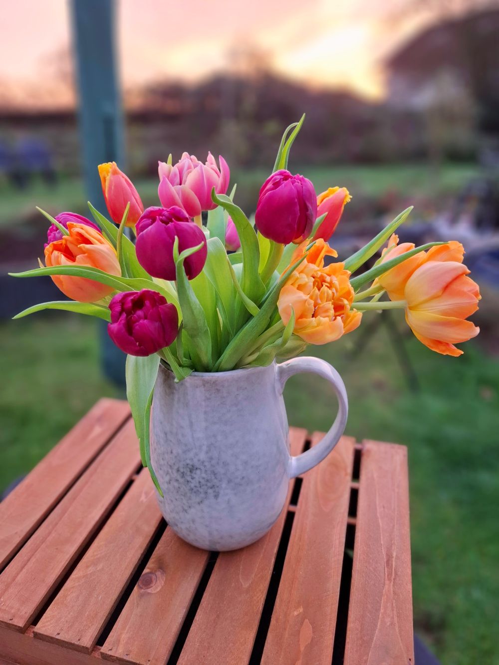Guten Morgen, Ihr Lieben! Als meine Eltern gestern Nachmittag vorbei schauten, brachte mir meine Mama einen herrlich farbenfrohen Strauß Tulpen mit. Ich bin heute Morgen bei Sonnenaufgang mit der Vase in den Garten gegangen, um die Farben bei Tageslicht einzufangen. Besonders gefallen mir die Tulpen mit zwei Blüten an einem Stil. Mein Sträußchen möchte ich heute gerne im Zuge des "Friday Flowerdays" zeigen und wünsche Euch einen wunderbaren Start in den Frühling und ein hoffentlich sonniges Wochenende!