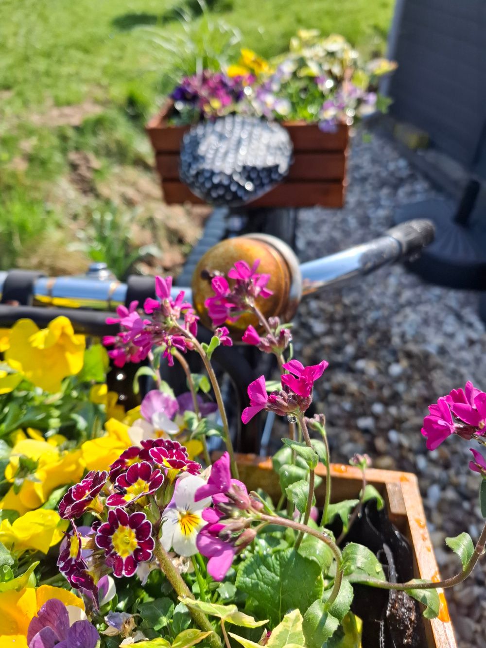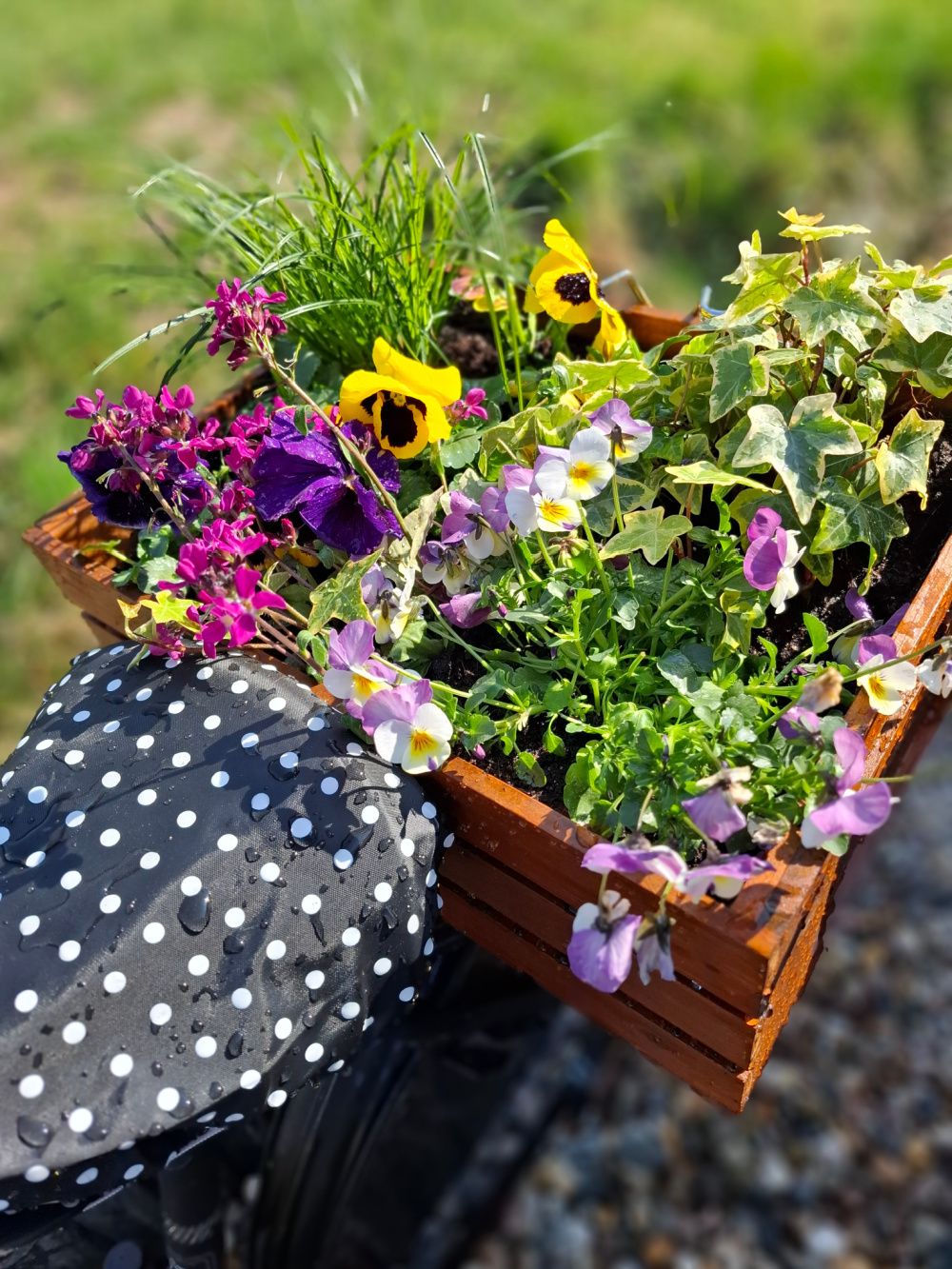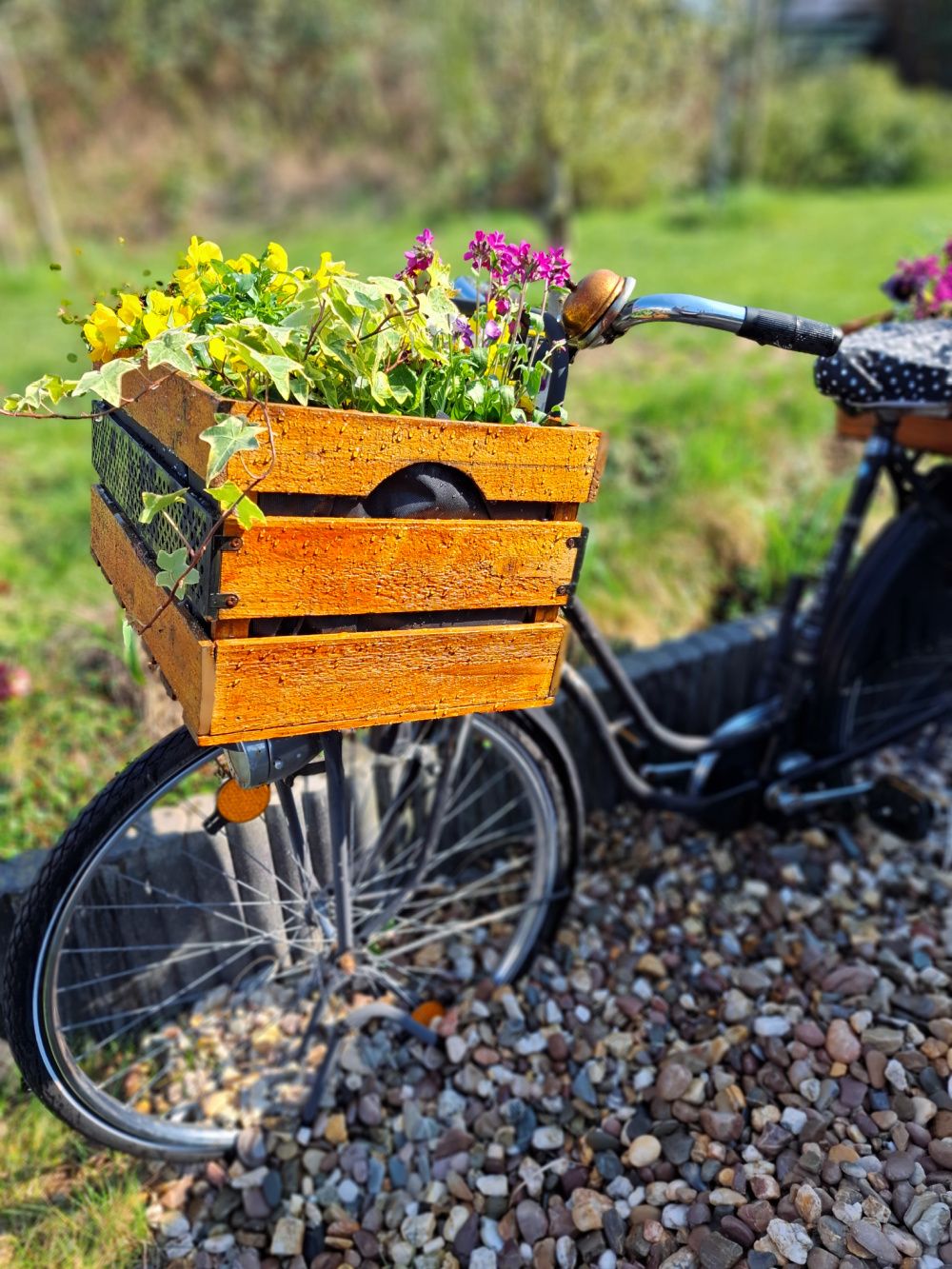 Vergangene Woche habe ich die Blumenkästen von unserem alten Hollandrad im Garten frisch mit Wetterschutzfarbe gestrichen und schließlich neu bepflanzt. Schaut, wie ausgeblichen das Holz der Kiste von den Jahreszeiten schon war! Der alte Original Sattel löst sich bereits in sämtliche Bestandteile auf, so hab ich ihm ein schönes Plastikhäubchen mit Polka Dots verpasst ;-)