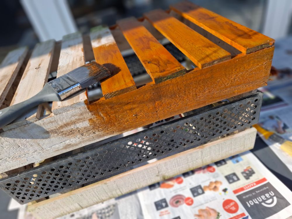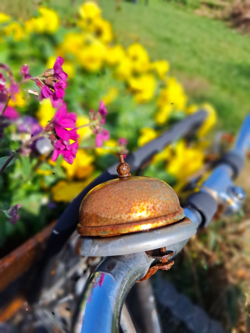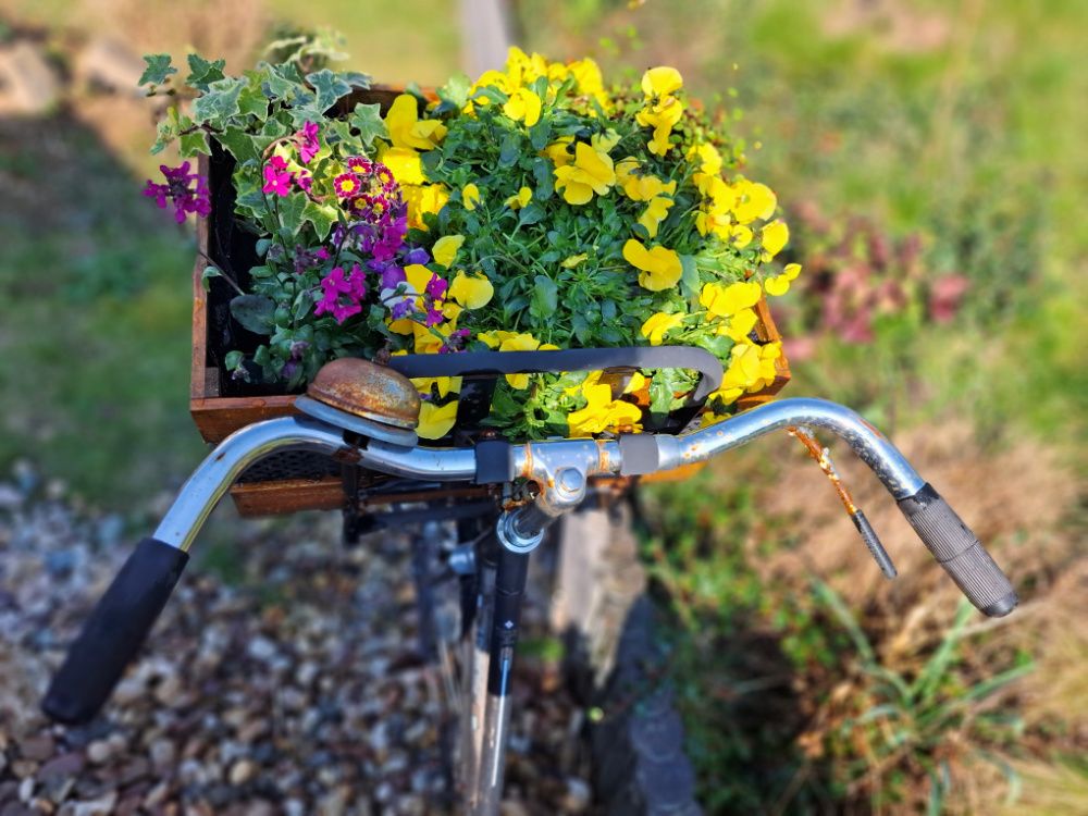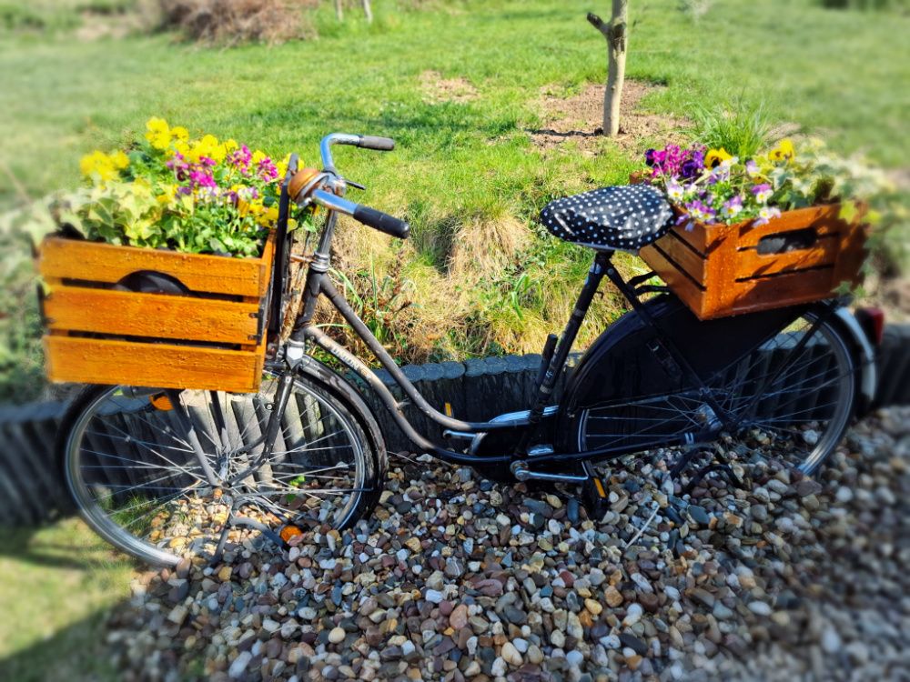 Vergangene Woche habe ich die Blumenkästen von unserem alten Hollandrad im Garten frisch mit Wetterschutzfarbe gestrichen und schließlich neu bepflanzt. Schaut, wie ausgeblichen das Holz der Kiste von den Jahreszeiten schon war! Der alte Original Sattel löst sich bereits in sämtliche Bestandteile auf, so hab ich ihm ein schönes Plastikhäubchen mit Polka Dots verpasst ;-)